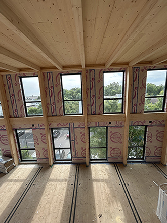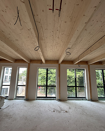 Sur le chantier, les équipes assemblent une ossature bois, un choix constructif maîtrisé visant à limiter l’empreinte carbone. Pas de climatisation, pas de faux plafonds : ici, le bâtiment se suffit à lui-même et crée sa propre architecture intérieure.