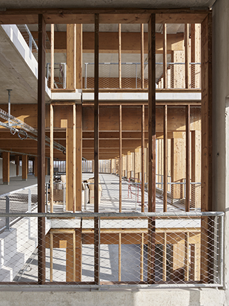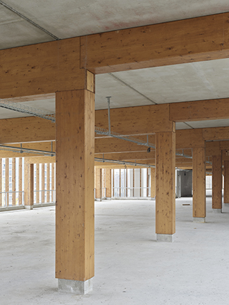 Le socle est réalisé en béton lasuré de teinte claire, garantissant robustesse et intégration dans les espaces publics environnants.Les baies du rez-de-chaussée sont habillées de menuiseries en bois massif, affirmant la matérialité chaleureuse et la qualité d’usage des espaces accessibles au public.Les façades techniques et les locaux non accessibles au public (centrale de production, chafferie, Data Center) sont traités en métal, avec une modénature spécifique à ventelles et une  finition gris uniforme, assurant cohérence et pérennité.Les niveaux supérieurs sont enveloppés de lames de bois à claire-voie, dont le rythme et l’espacement s’adaptent aux contraintes contextuelles : plus ouvertes côté place publique pour maximiser la transparence, plus resserrées côté habitations pour limiter les nuisances visuelles.Les portiques de la structures bois-béton en arrière-plan, visibles à travers les façades, dessinent la silhouette “exo-squelette” du bâtiment et soulignent la légèreté et la technicité de l’ensemble.Les gardes-corps des étages supérieurs réalisées en maille inox tendue sur cadres en acier galvanisé minimalistes reprennent une trame verticale discrète jusqu’à disparaitre et renforcer la lecture unitaire de la façade bois.Les panneaux photovoltaïques de toiture, intégrés dans une démarche d’autonomie énergétique, parachèvent la composition. Concédant de la ZAC Ferney-Genève Innovation : Pays de Gex agglo (01)Maître d’ouvrage : SPL Terrinnov