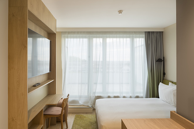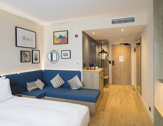 Contrairement à l’hôtellerie de tourisme qui voit son locataire éphémère pour un repos court et efficace, les chambres de l’hôtellerie de passage se doivent de compenser d’autres moments. Ainsi, procurent-elles un confort compensant le temps passé hors de chez soi. L’acoustique, doublement complexe à traiter en restructuration et en hôtellerie, est ici moteur dans l’aménagement des chambres.