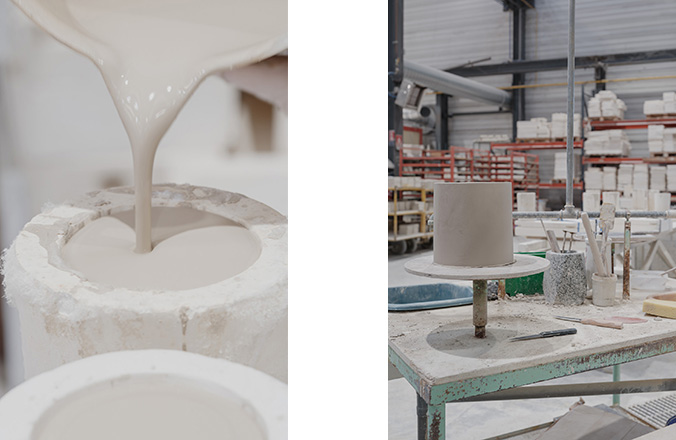 Chaque lampe est réalisée en grès coulé à la main, en petite série, dans une petite manufacture (en Indre-et-Loire) garantissant une finition unique. Le contraste subtil entre la matière brute intérieure et la surface extérieure émaillée en couleur, sublime la diffusion de la lumière, créant un jeu délicat d’ombres et d’éclats teintés.